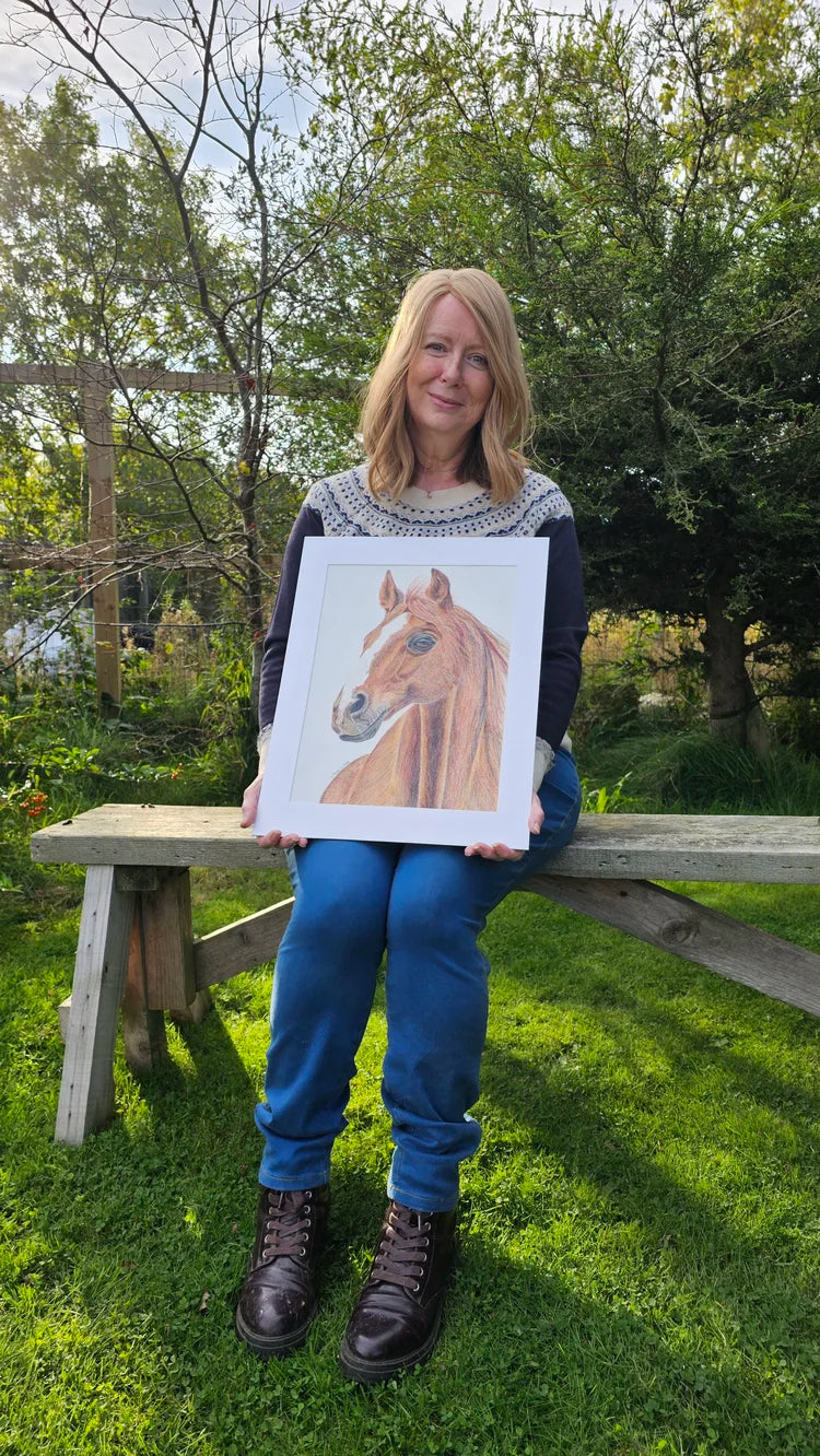 Enjoy the beauty of this horse portrait, drawn with artist-quality coloured pencils on Clairefontaine Pastel Mat. The piece highlights the horse's natural beauty with vibrant colours and a flowing mane, bringing a sense of movement and life. Professionally mounted and ready to frame, this artwork is perfect for those who appreciate equestrian-themed pieces. The mounted size is approximately 15 x 19.5 inches, making it a wonderful addition to any home or collection.
